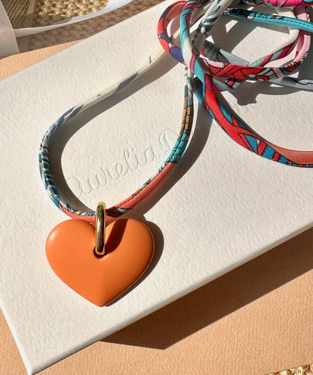Our best-selling signature heart pendant is now offered in a larger size. Like our smaller heart, this heart is made from a composite resin with a coral color. It has a beautiful 18-karat yellow gold bail, which opens to clip into any chainlink size. It is the perfect sized pendant for a short or long or a more substantial necklace chain. It also pairs nicely with our beaded necklaces. Oui, oui, it is a versatile and wonderful piece!