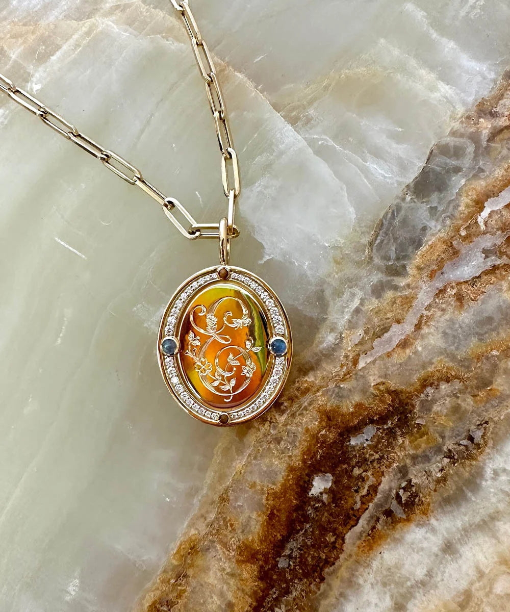 Our Medium-Large Corinna Pendant (size 25mm) with pave diamonds and four stones of your choosing beautifully frame whatever hand engraving you choose. This photo shows a custom version we did for a client with Tiger's Eye and Labradorite cabochon stones. The front includes a custom hand engraving design of her first initial.