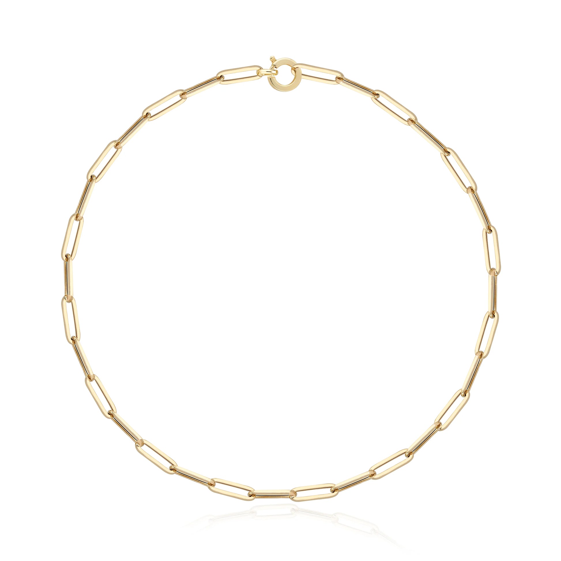 We love an elongated chainlink and this large link necklace immediately won our hearts. The Natalie necklace rests on your collar bone, making it the perfect necklace for a deep V or crewneck. Our round clasp provides a nice decorative element- add a pendant for a more statement look.