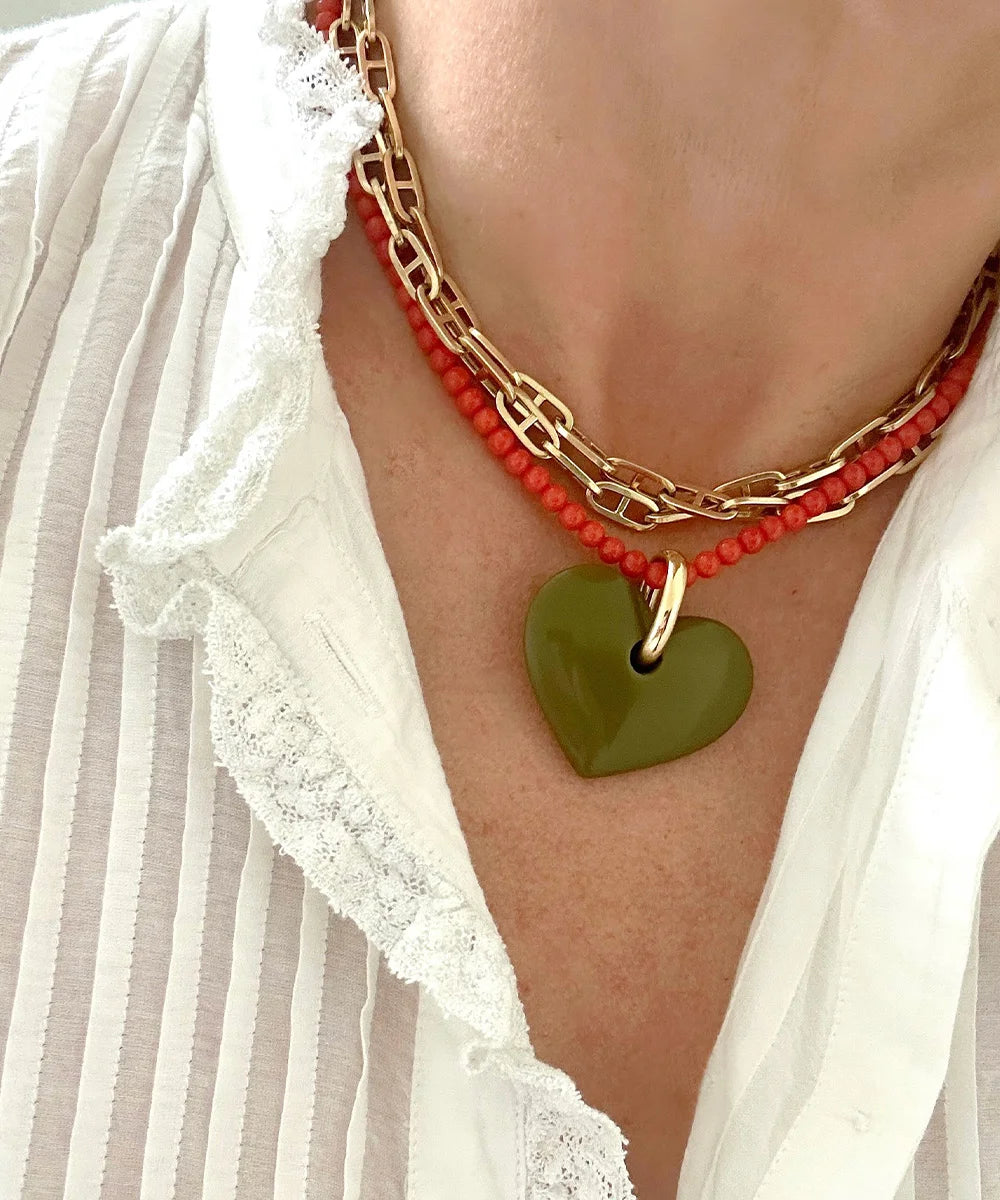 Our best-selling signature heart pendant is now offered in a larger size. Like our smaller  heart, this heart is made from a composite resin with an olive green color. It has a beautiful 18-karat yellow gold bail, which opens to clip into any chainlink size. It is the perfect sized pendant for a short or long or a more substantial necklace chain. It also pairs nicely with our beaded necklaces. Oui, oui, it is a versatile and wonderful piece!