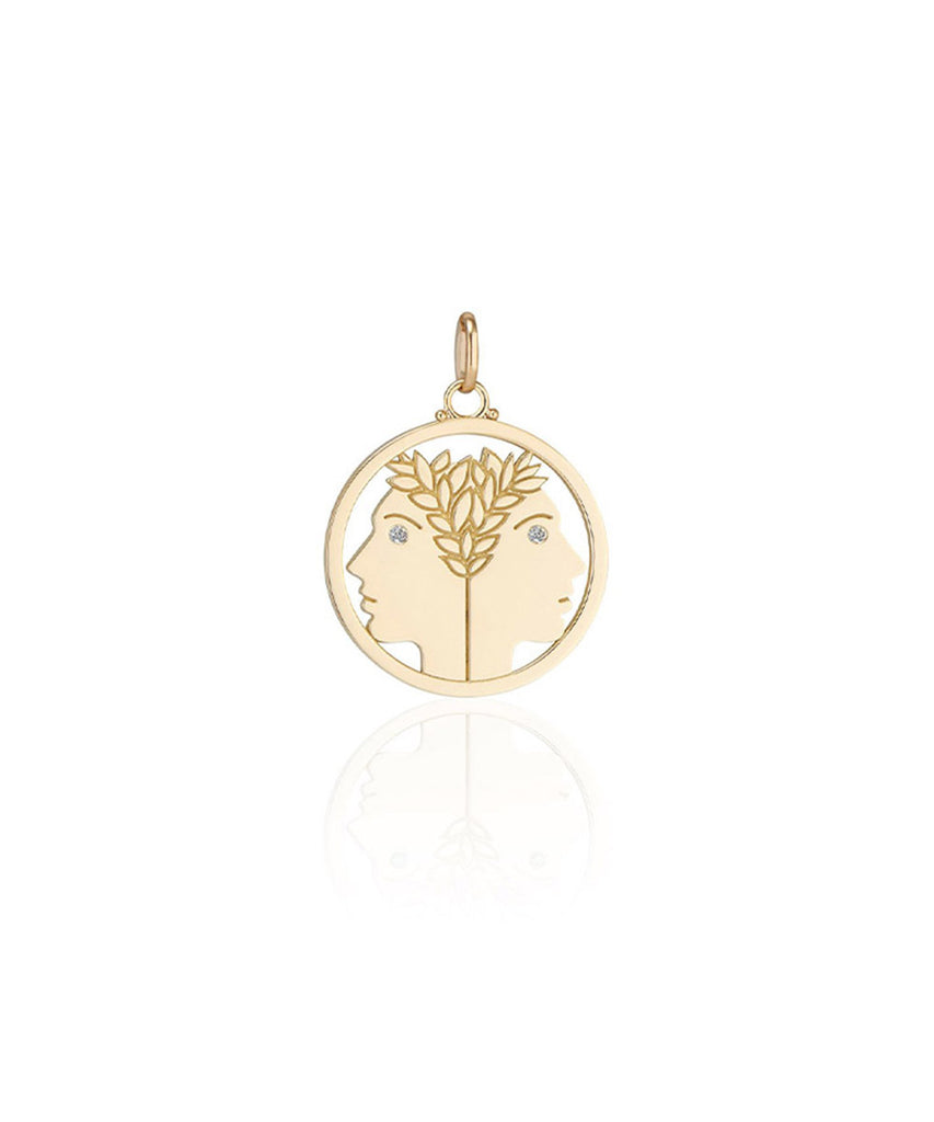 Our signature Small Gemini Pendant, depicting the twins, is with the eye customized from your choice of precious stones: blue sapphire or a birthstone. A great everyday piece, this pendant is perfect worn alone or layered with other styles.